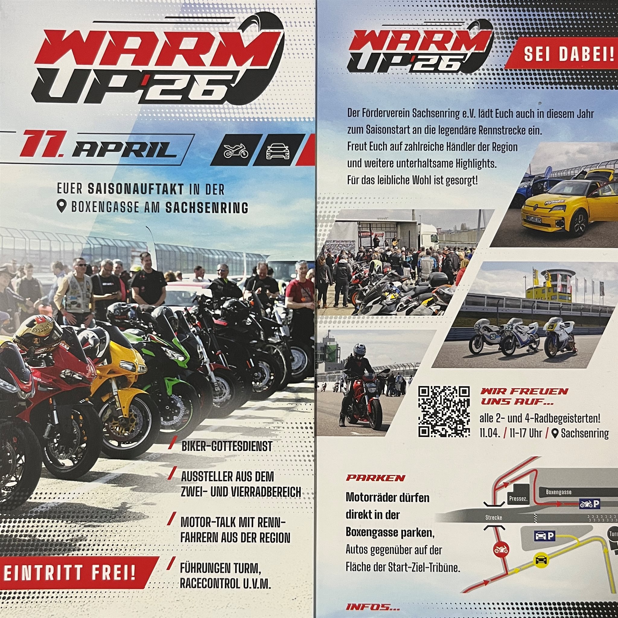 Der Saisonauftakt am 11 April 2026 in der Boxengasse am Sachsenring ist etwas für alle 2- und 4-Radbegeisterten. Start ist 11 Uhr und der Eintritt ist frei. Motorradfahrer dürfen direkt in der Boxengasse parken. Wir freuen uns audf euch.